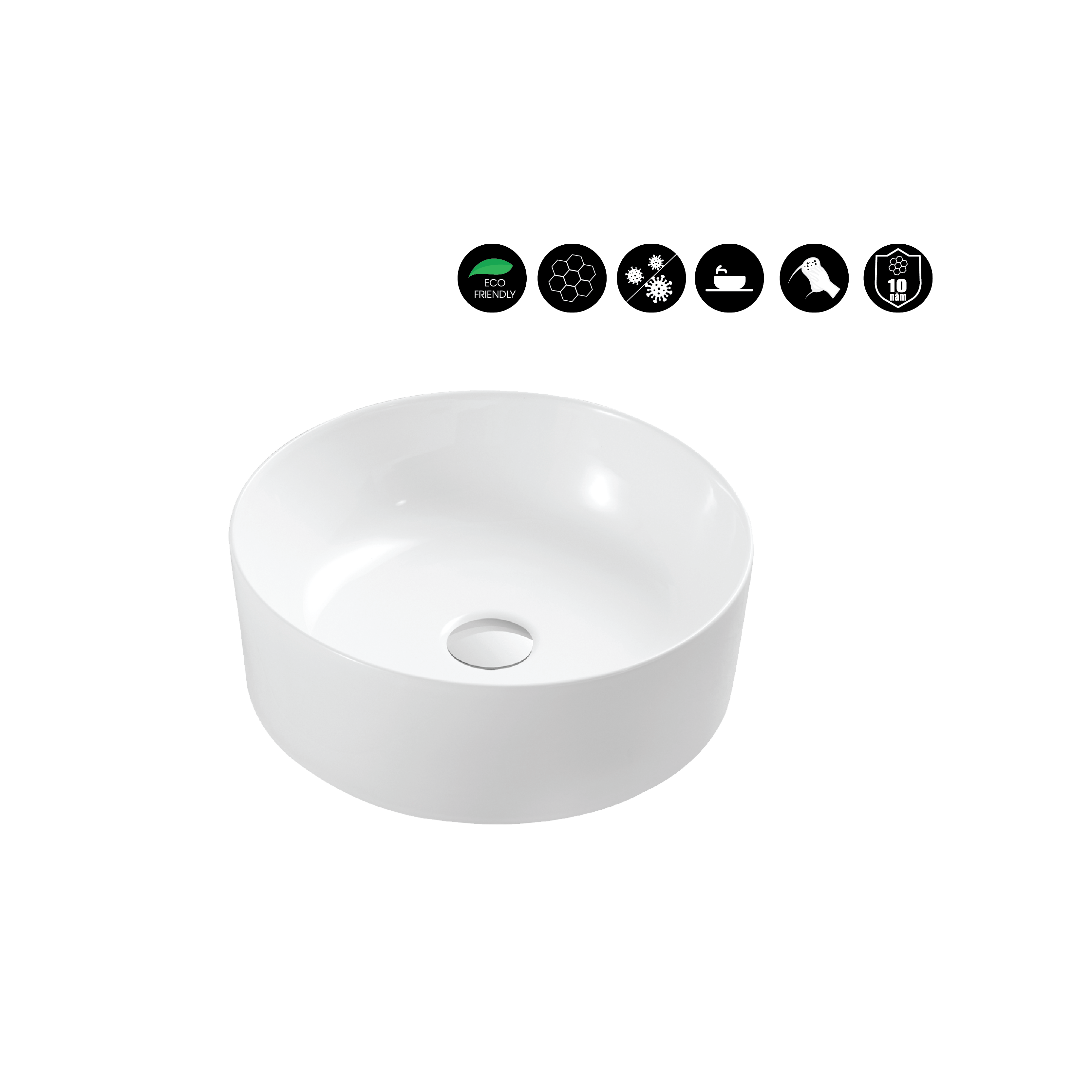 - Thiết kế chậu rửa mặt tròn hiện đại, nhỏ gọn, kết hợp được với nhiều mẫu bồn cầu, nhiều không gian kiến trúc khác nhau.