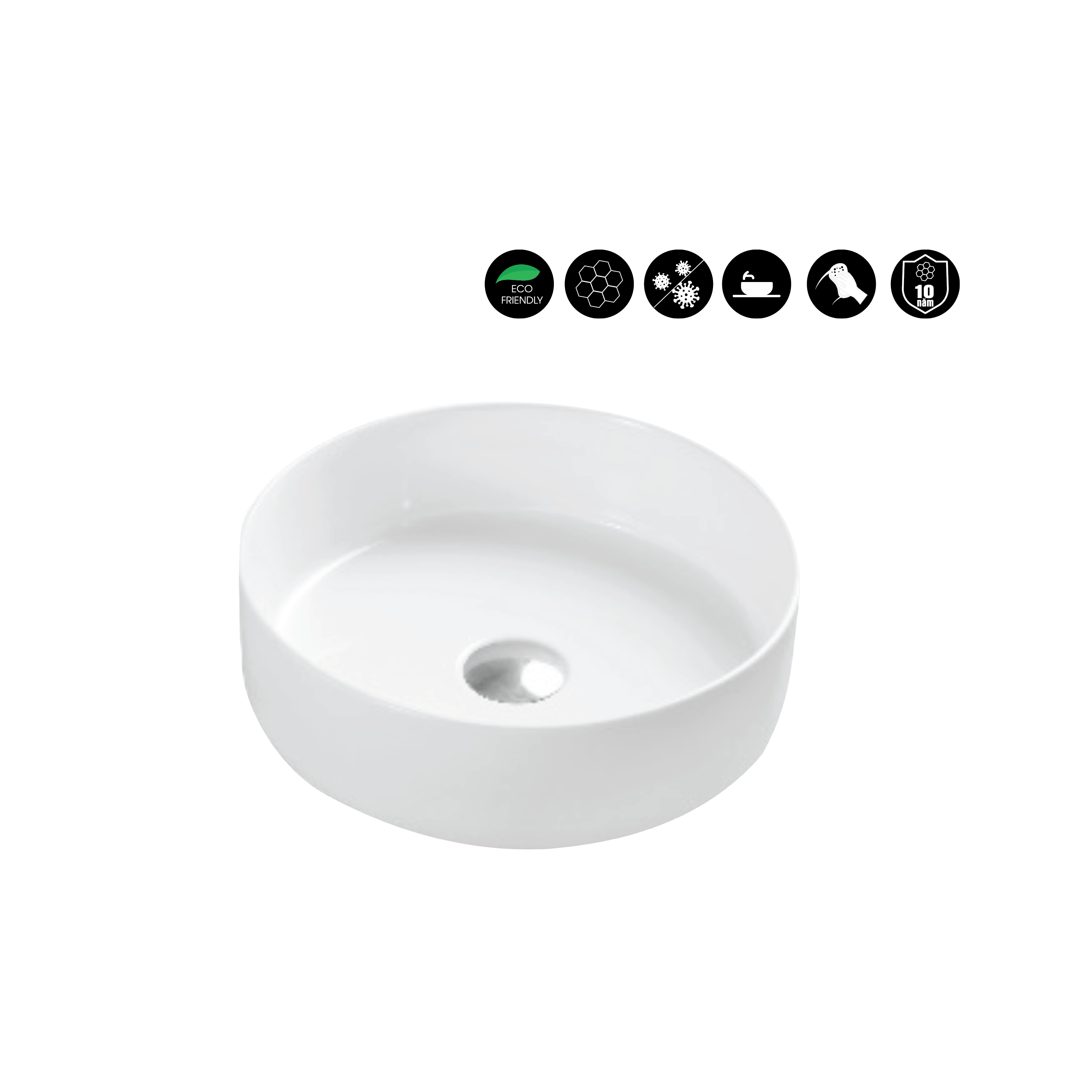 - Thiết kế chậu rửa mặt tròn hiện đại, nhỏ gọn, kết hợp được với nhiều mẫu bồn cầu, nhiều không gian kiến trúc khác nhau.