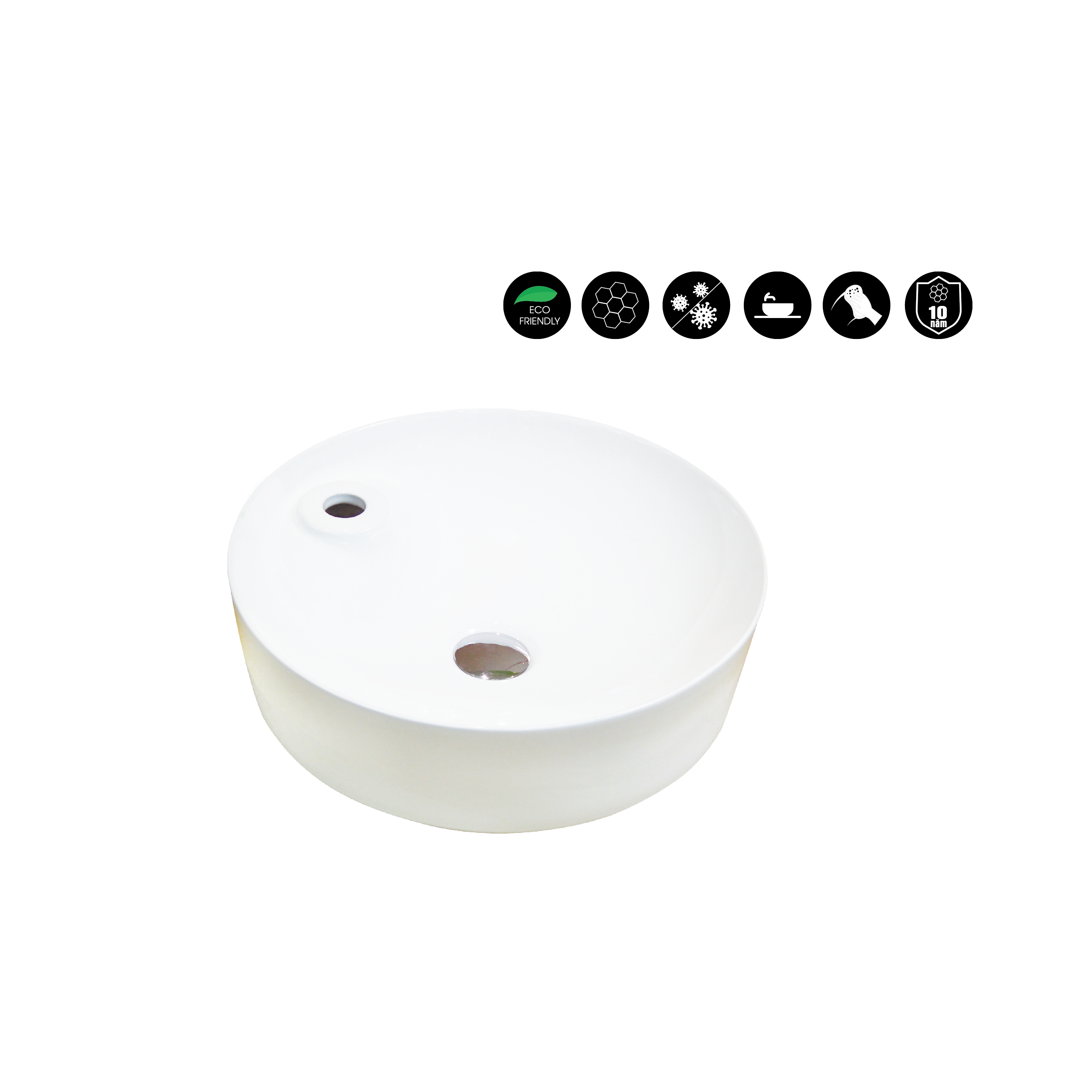 - Thiết kế chậu rửa mặt tròn hiện đại, nhỏ gọn, kết hợp được với nhiều mẫu bồn cầu, nhiều không gian kiến trúc khác nhau.