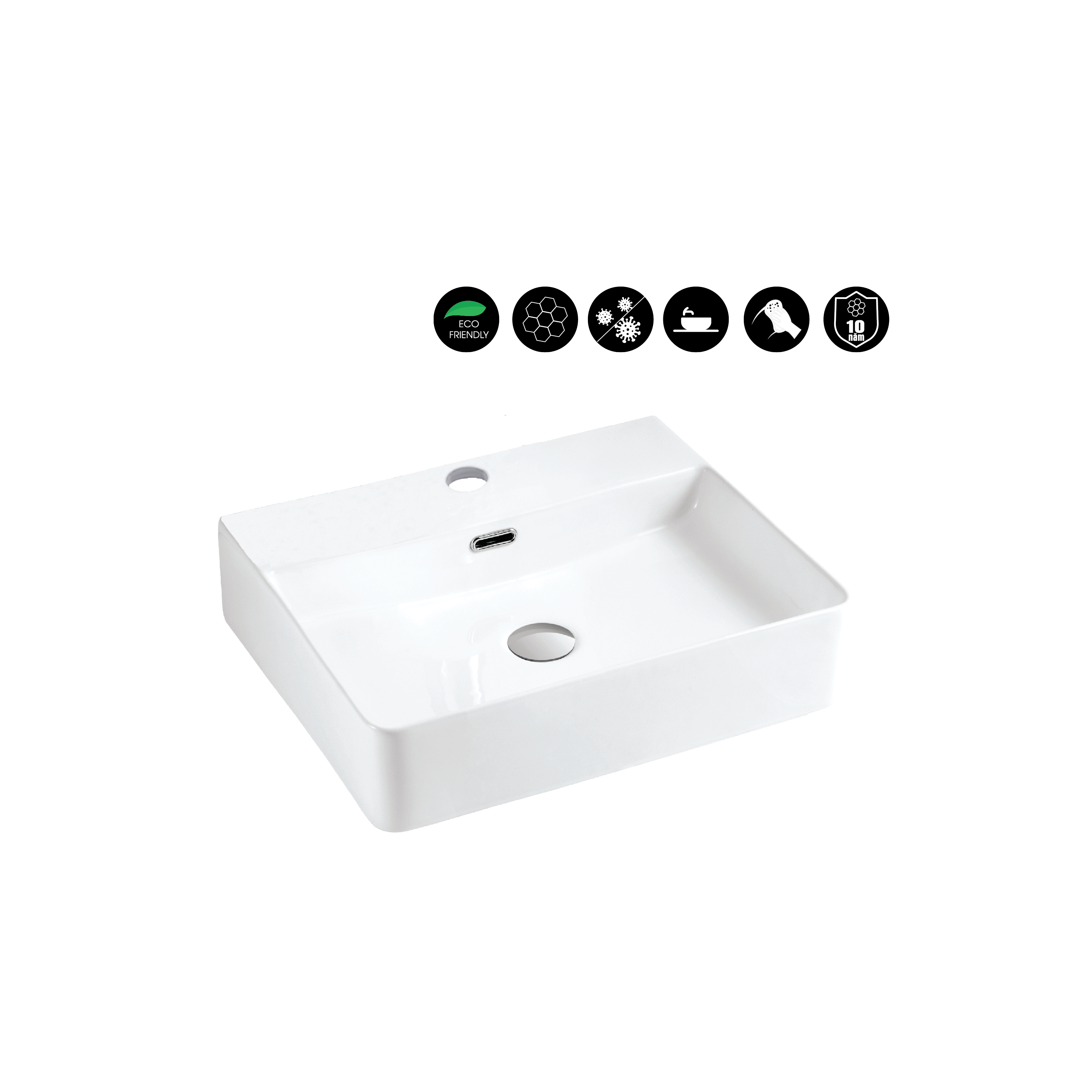 - Chậu rửa mặt chữ nhật làm từ chất liệu gốm sứ được nung nóng ở nhiệt độ cao tạo độ cứng chắc và bền đẹp cho sản phẩm. Bề mặt tráng men sáng bóng, chống trầy xước, hạn chế hình thành bụi bẩn và dễ dàng làm sạch, ngăn không cho vi khuẩn tích tụ lâu ngày gây hại sức khỏe người sử dụng.
